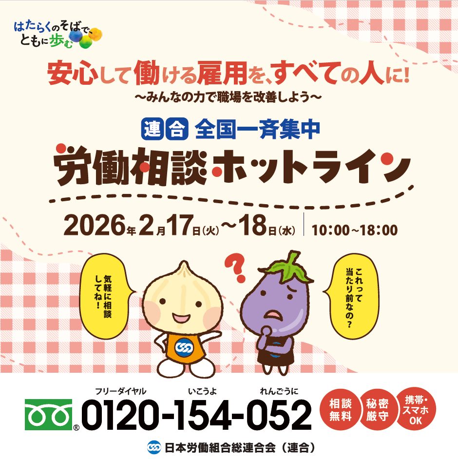 今回は、労働契約の更新時期を迎える年度末に向け、解雇や雇止めをテーマに、2026年2月に「連合全国一斉集中労働相談ホットライン STOP!雇用不安~みんなの力で職場を改善しませんか~」を実施します。